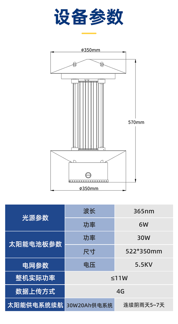 产品采用智能化设计,具备光控与雨控功能,可实现白天自动关闭、夜晚自动开启,遇雨自动断电保护,确保使用安全。该设备覆盖面积广,杀虫效率高,操作简便。